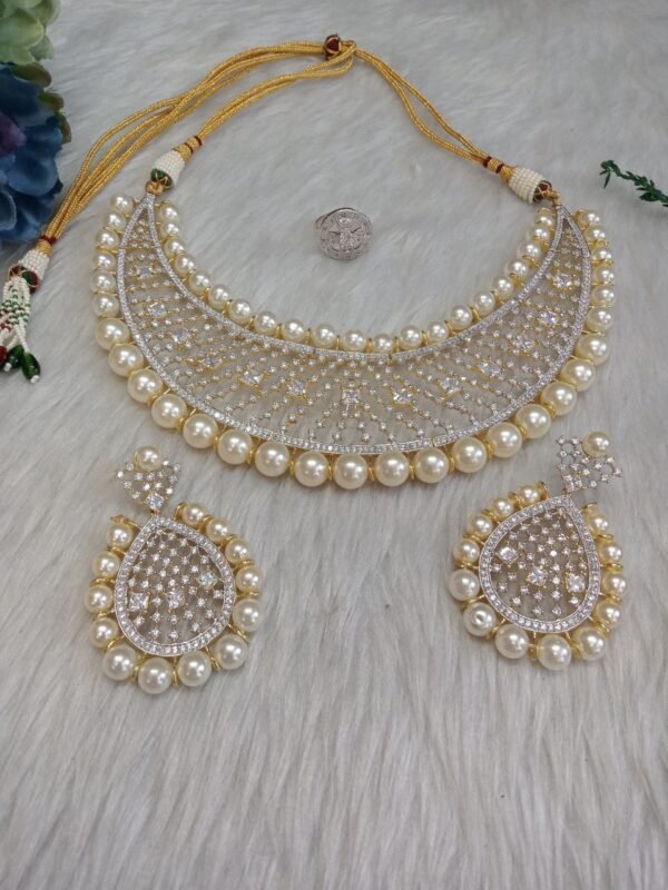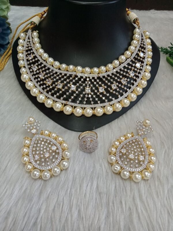 Premium Quality light weight AD Stone, Pearl Broad Necklace with long Earrings and Size Adjustable Ring (Crystal Color) by Shivay Creative Arts