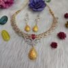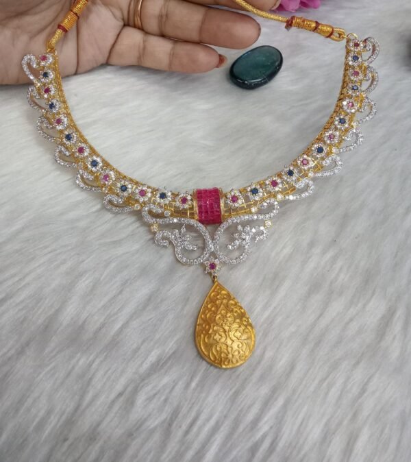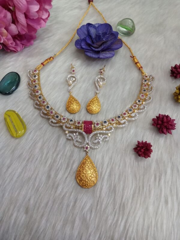Necklace – Gold Plated Neelam, Ruby & Crystal AD Stone Necklace with Earrings SCA205043