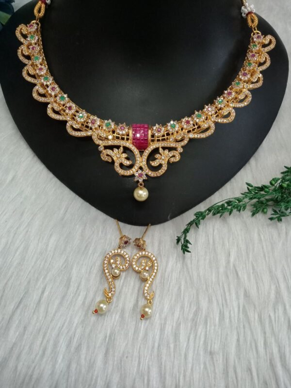 Necklace – Gold Plated Ruby, Green & Crystal AD Stone Necklace with Earrings SCA205045
