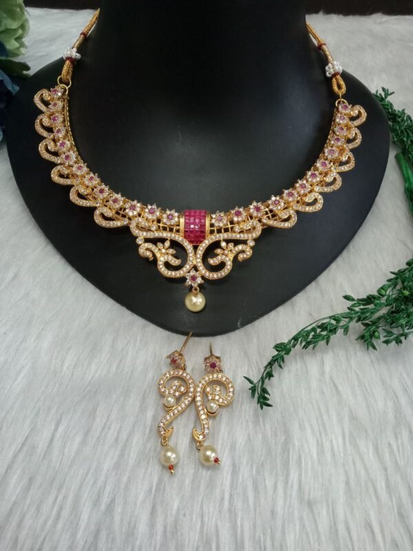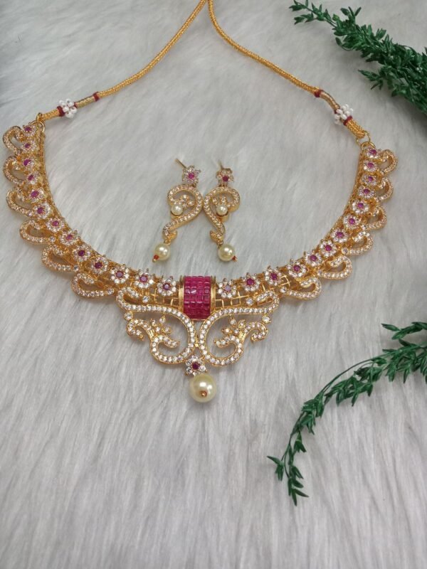 Necklace – Gold Plated Ruby & Crystal AD Stone Necklace with Earrings SCA205045